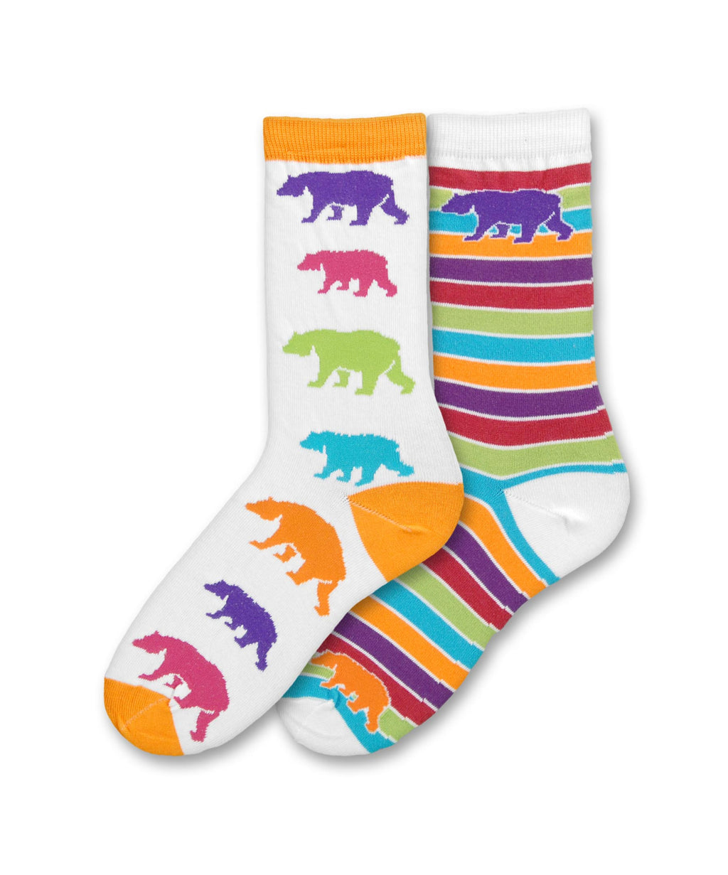 Last Chance! Small Size! Bear Mismatched Sock is a wild and fun sock with bears in bright colorful and bold print of purple, fuchsia, avocado green, teal blue and orange on a background of white with orange band, heel and toe for one of the mismatched pair. The other sock is filled with the same colors but in rows of wide stripes. The top ba...